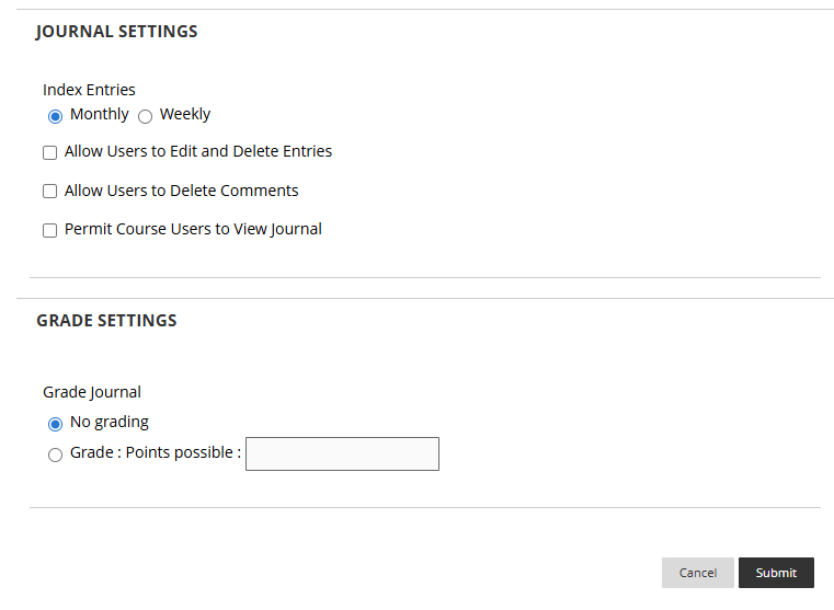 In the Journal Settings, select how you want the blog to be indexed (monthly or weekly) and whether to allow users to edit and delete entries and/or comments. You also have the option to permit course users to view the journal (meaning that the journal will not be private). Select whether or not to grade your Journal and click Submit to save your changes.