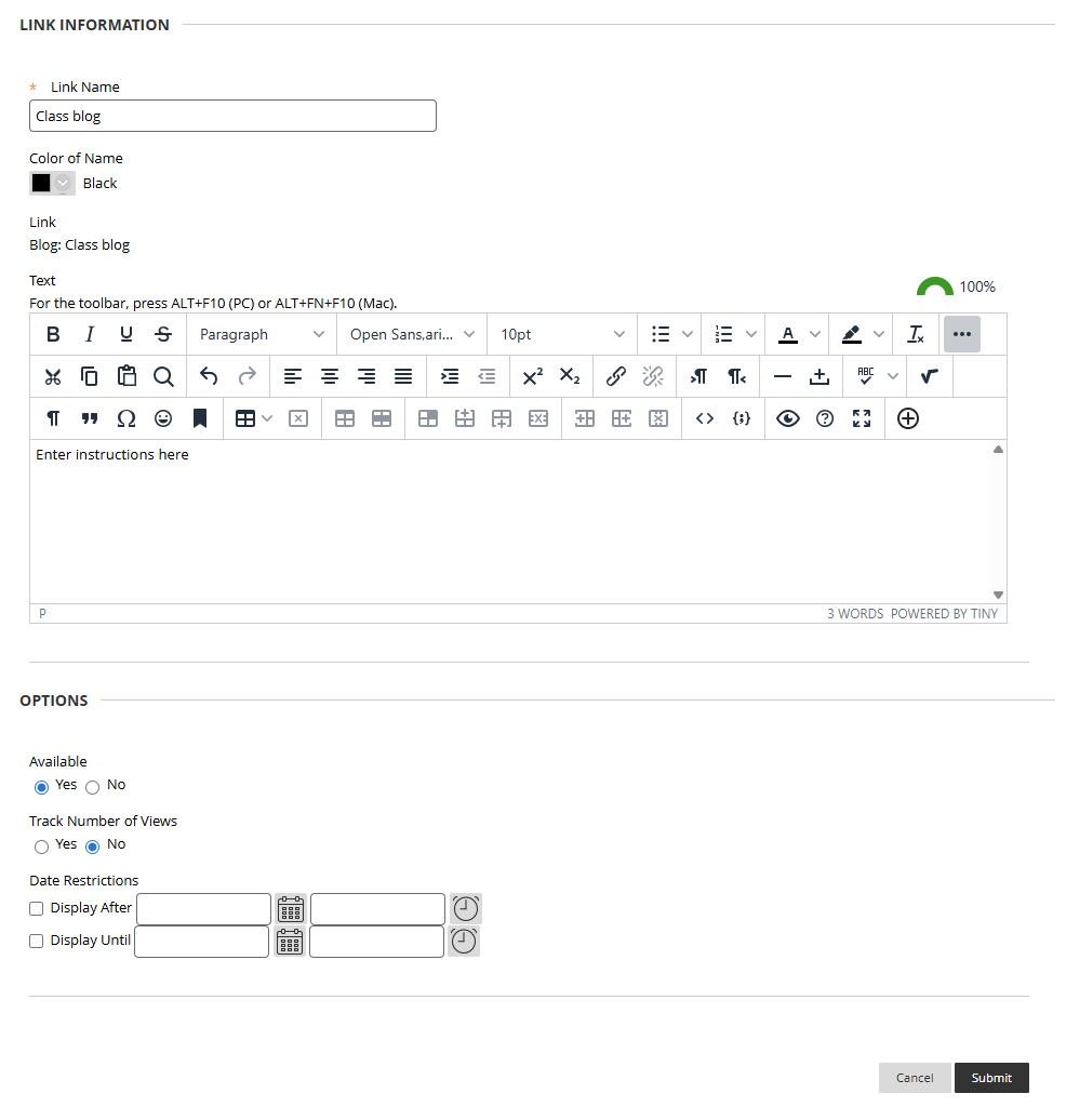 Once you have created a blog or journal you will need to create a link for students to access it. You may create a link directly from the Course Menu or from within a Content Area.