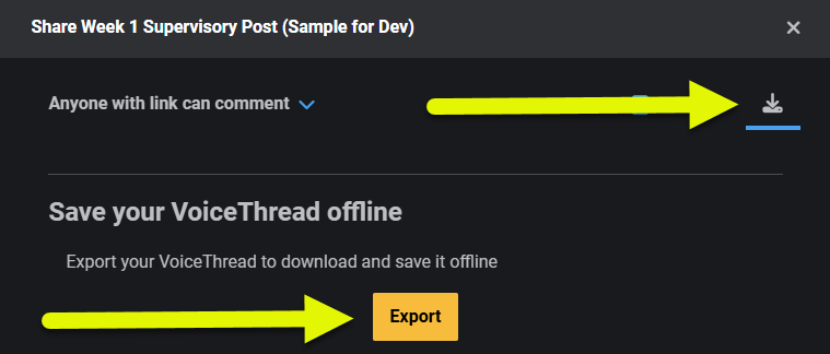 By default, anyone with whom you have shared your VoiceThread can export it. If you do not want them to be able to do this, you’ll need to edit the settings for your VoiceThread.