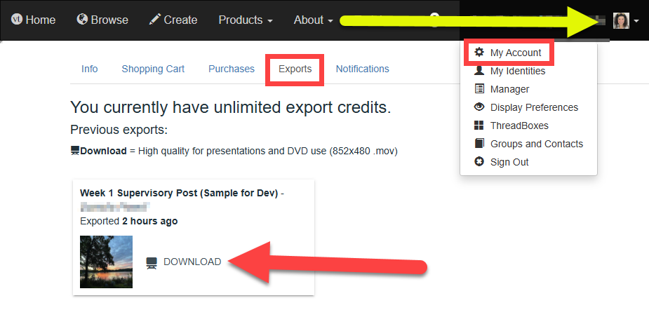 This will bring you into your VoiceThread account. Click on the Exports tab. Look for the video you want to download and click on the Download button.