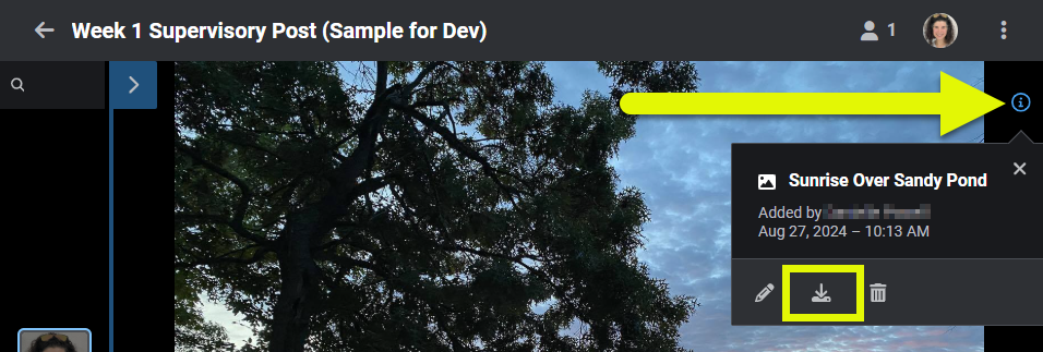 From within a VoiceThread, click on the slide details icon (blue "i") near the top-right corner of the page. This will open a menu. Click the Download button.
