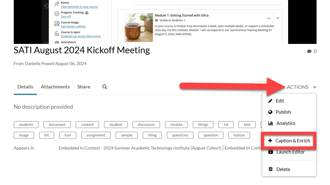 Click on the Actions button below the media. This will open a menu. Select Caption & Enrich.