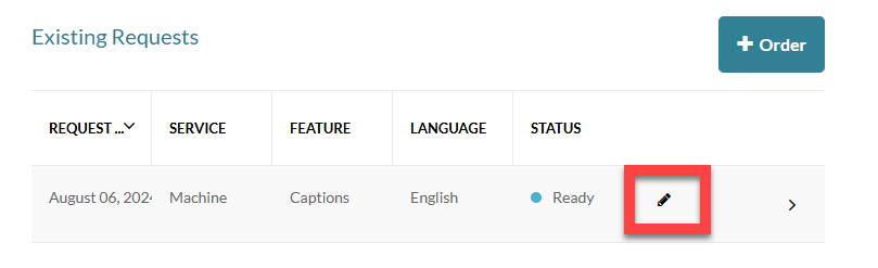 This will bring up to a list of the caption requests for this video. Select your captions request and click Edit (pencil icon).
