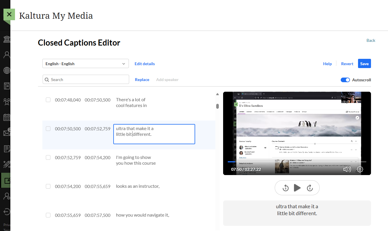 For detailed instructions on editing captions, refer to Kaltura Media's Editing Captions support article.