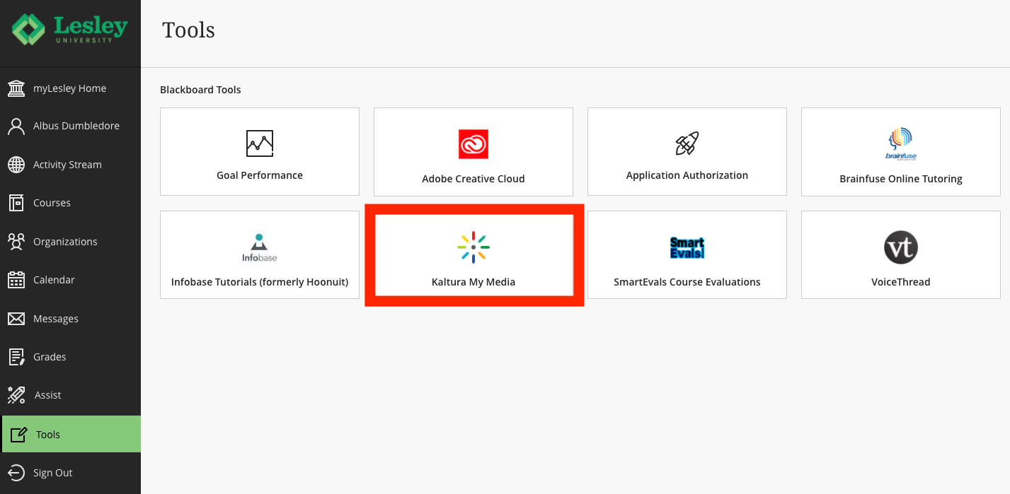 To access your My Media, click on the Tools link in the Global Navigation menu. This will bring you to the Tools area. Select Kaltura My Media.
