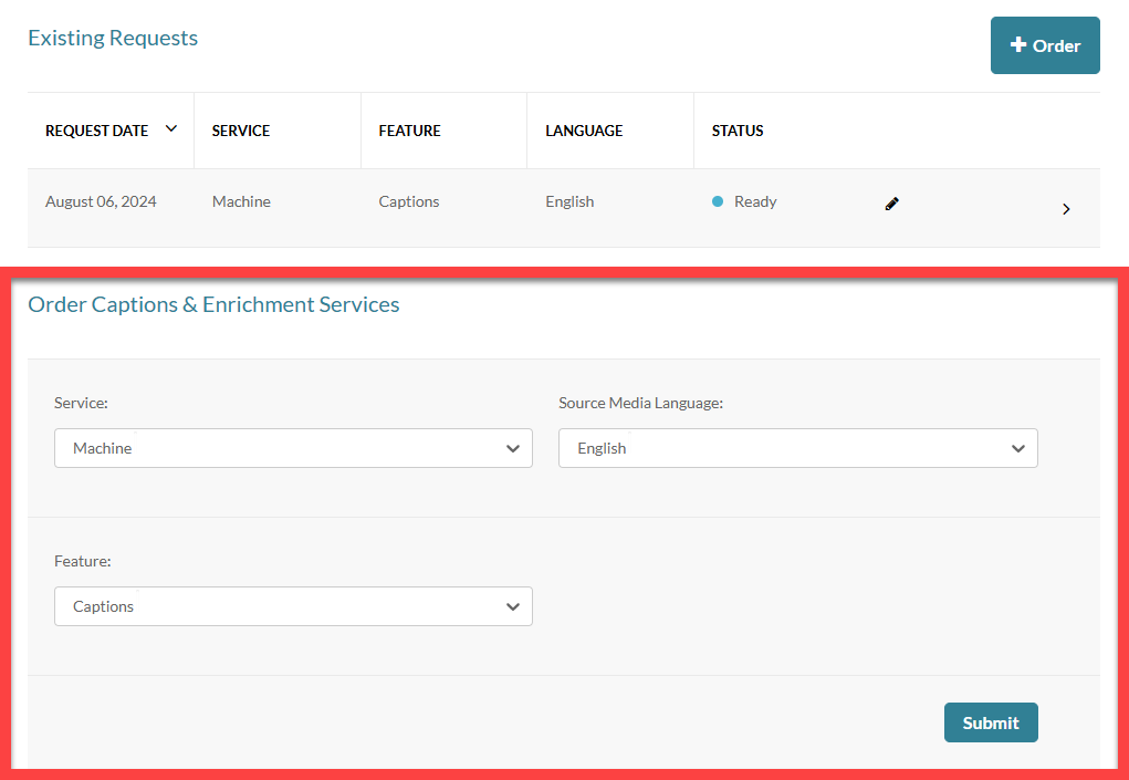In the Order Captions & Enrichment Services section, select your Source Media Language and click Submit.