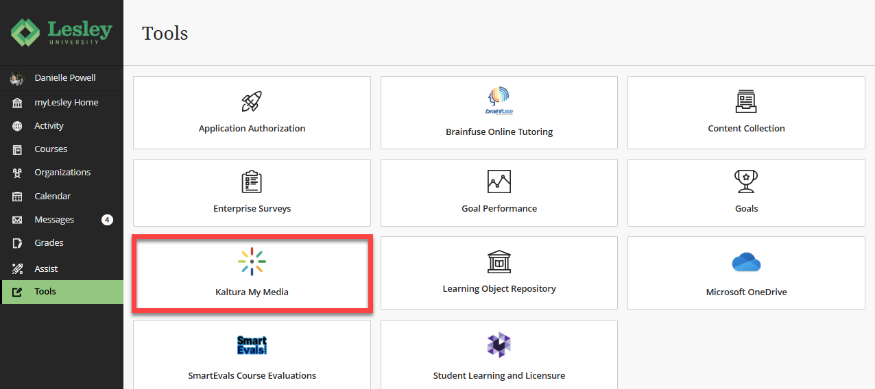 To access your My Media, log into myLesley and click on the Tools link in the Global Navigation menu. This will bring you to the Tools area. Select Kaltura My Media.