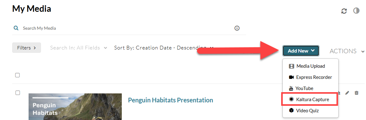 This will bring you to your Kaltura My Media. Click on the Add New button at the top of the page. This will open a menu. Select Kaltura Capture.
