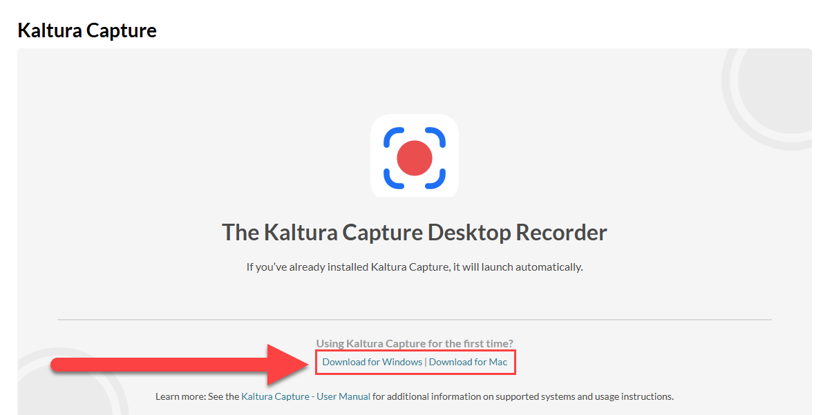 If this is your first time launching the tool, you will need to download the Kaltura Capture Desktop Recorder and install it on your computer. Select Download for Windows or Download for Mac.