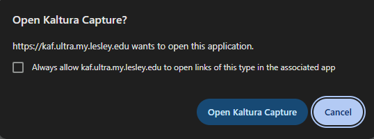 The launch page will load. If you have already installed Kaltura Capture, you may see a message asking you to launch the tool or it may launch automatically. This may vary, depending on your browser and settings.