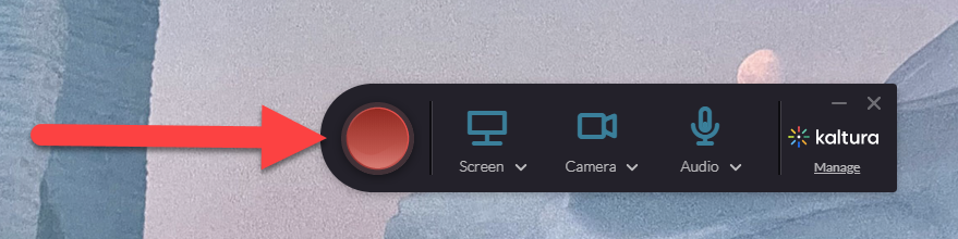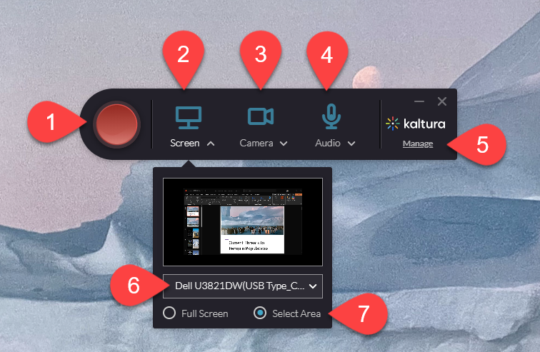 By default, Kaltura Capture will record your screen, camera, and microphone. You can toggle each of these options on and off by clicking on them. If you have multiple devices, click on the drop-down menu to select your preferred device.
