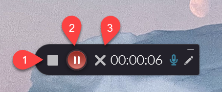You will see a three second countdown and then your recording will start. During recording, the recording tool will be minimized to the lower corner of your screen. Use this menu to Stop, Pause, or Cancel your recording.