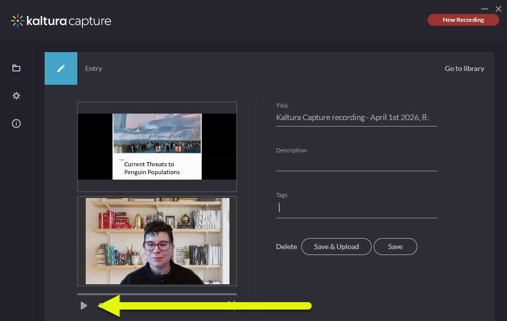 Click on the Play button to preview your recording. If you recorded from multiple sources (ex your screen and webcam), both recordings will be play simultaneously.