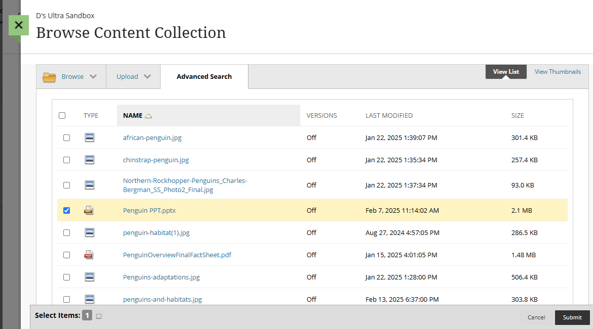 This will bring you to your Content Collection. You may browse your files or use the Search feature to find your desired file. Select your file and click Submit.