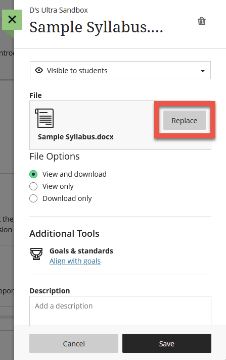 Do you need to make changes to your file? Instead of re-uploading your file (and creating duplicate copies in the Content Collection), replace or overwrite your file. This will replace the file in your content area as well as in the Content Collection.