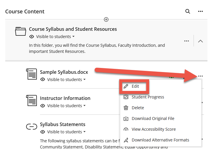 If your file is located in your Course/Organization Content area or within a Learning Module or Folder, click the More Options (...) button next to the file. This will open a menu. Select Edit.