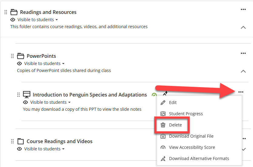 To delete files from your Course/Organization Content area or from within a Learning Module or Folder, click the More Options (...) button next to the file. This will open a menu. Select Delete.