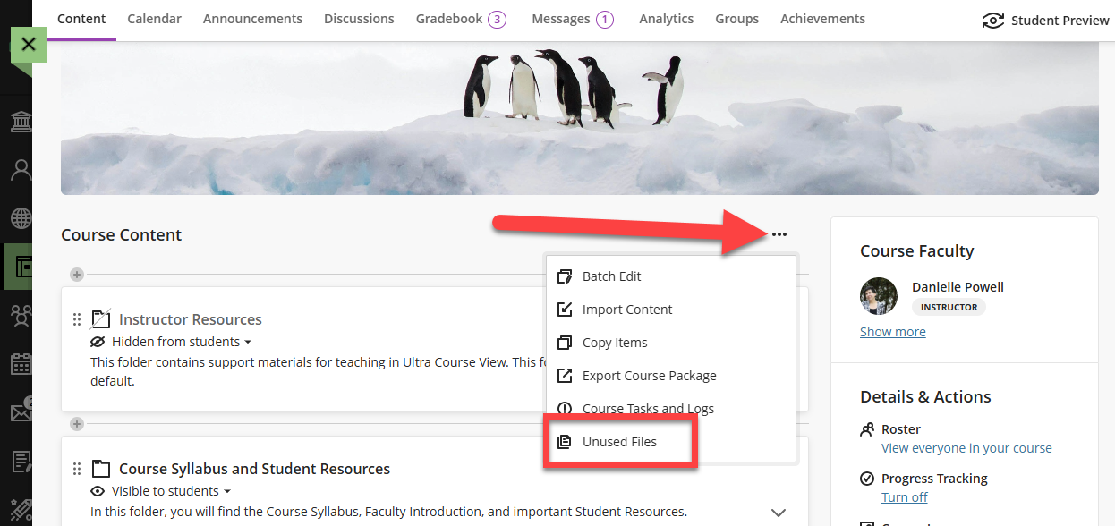 You may also bulk delete unused files in your Ultra course/organization. From the Course/Organization Content page, click on the More Options(...) button at the top of the page to open a menu. Select Unused Files.