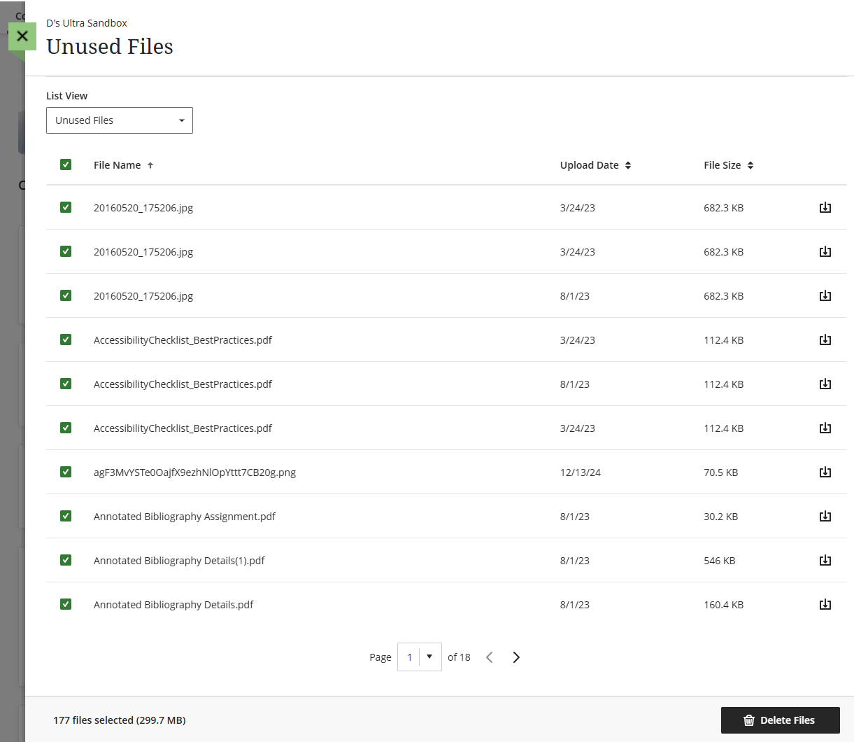 This will bring up a list of unused files in your course/organization. Select the files you wish to delete and click Delete Files.