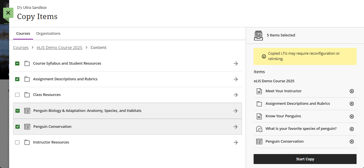 Learning Modules are a great way to organize your content. Students may view their progress within a Learning Module and navigate from one item to another by using navigation buttons at the top of the module page. You can also personalize your learning modules with thumbnail images for a more engaging experience. Within your learning module you may add different types of content, including folders, Ultra Documents, Assignments, Tests, Discussions, links, and more.