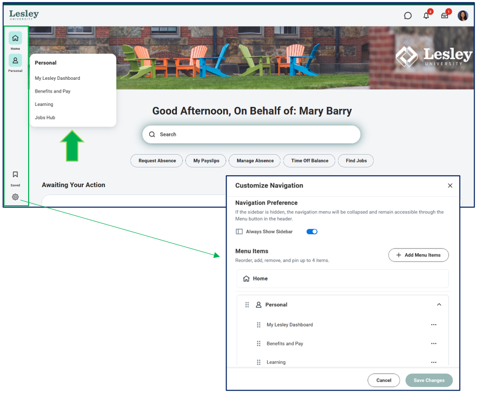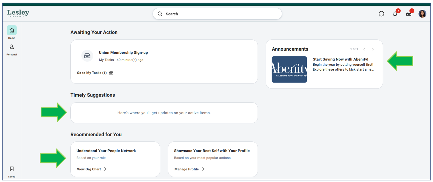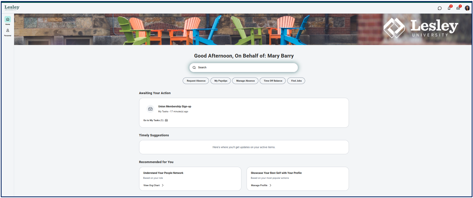 The Home page displays various worklets that help a colleague view and manage their information, as well as accessing tasks that may require your attention. Your Home page view is based on your role in the organization.