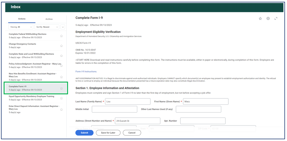 Click on the Complete Form I-9 task. When clicking, you will find the form on the right-hand side of your screen where you can complete it right from your inbox.