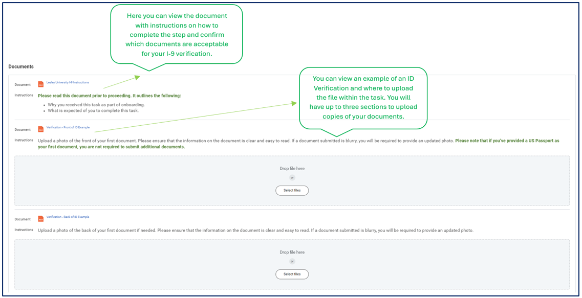 Within the task are instructions and help text available to help you know which documents you will need and how to upload them into Workday.