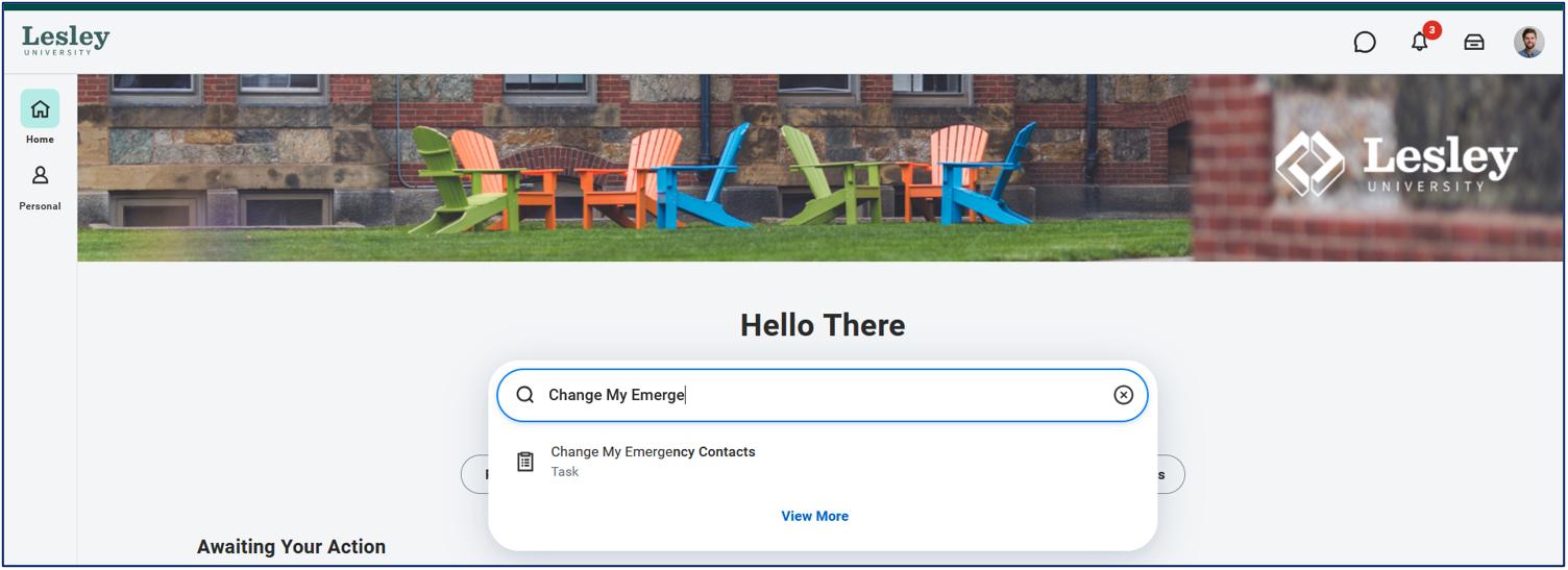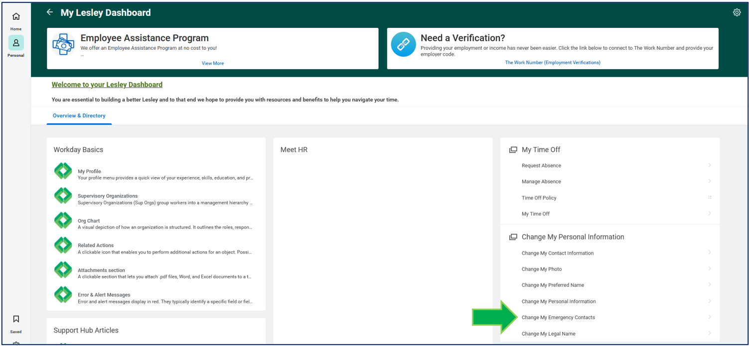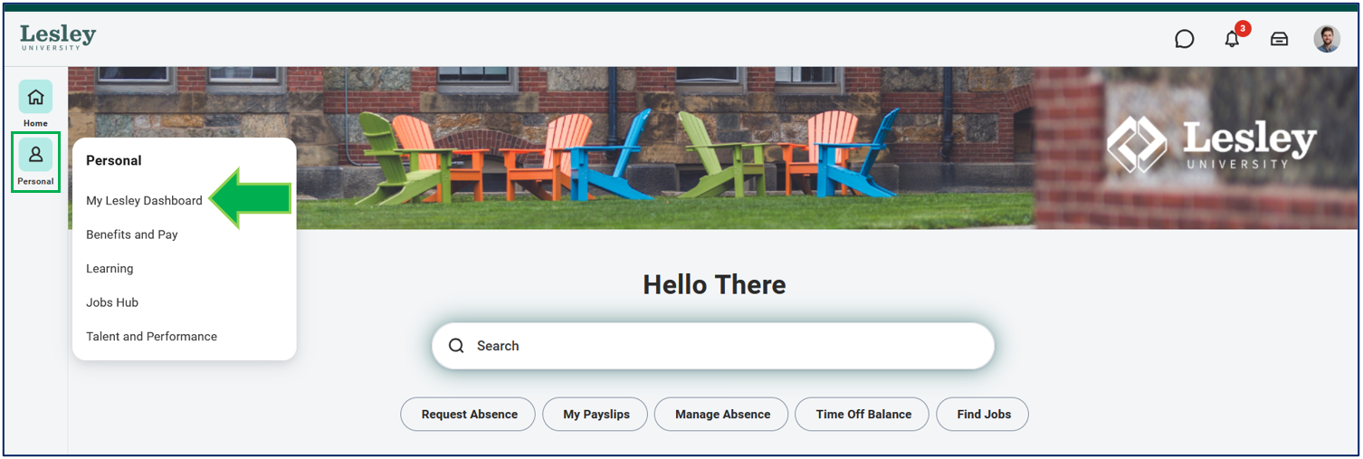 Click on the My Lesley Dashboard from the Personal category on the navigational panel on the left-hand side of your Workday homepage.
