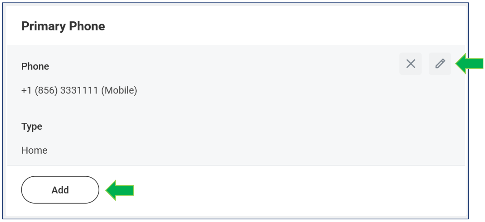 To make changes to an existing record, click the gray pencil icon. If you are adding a new contact, click the Add action to initiate a new field to enter their information.