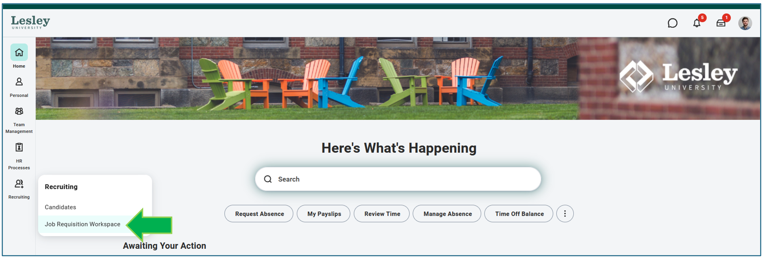On your Workday home screen, locate and select Recruiting from your side bar. Under Recruiting, please select Job Requisition Workspace.
