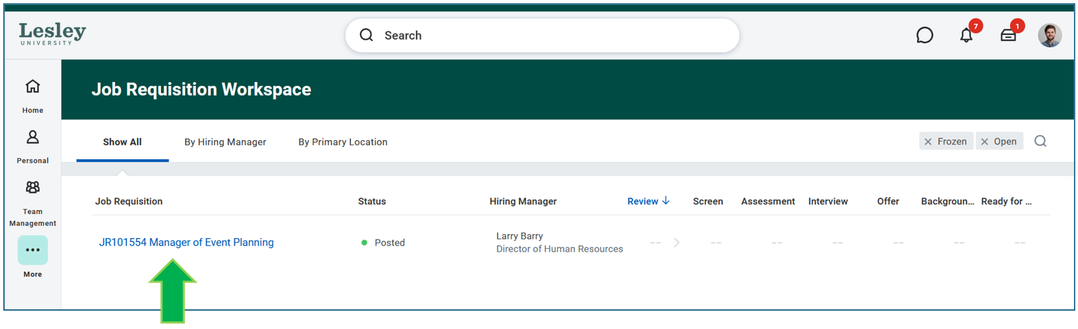 Once in the Job Requisition Workspace, you will see all active requisitions where you are the Hiring Manager. As a department head or team leader, you may also see open job requisitions where your direct reports are the Hiring Managers listed here as well.