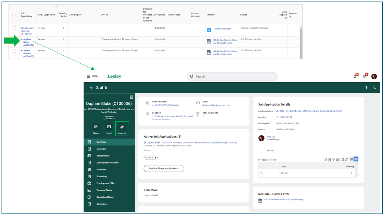 Clicking on each candidate's profile gives access to their resume, application, and any attached documents. Click the paperclip icon above Resume to view their application documents.