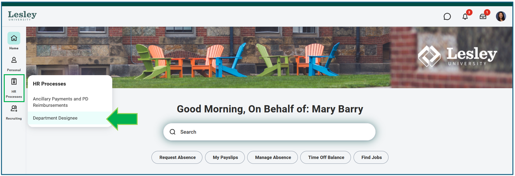 To access the Designee Dashboard, on the Workday homepage, under the HR Processes category, you will find the Department Designee application.