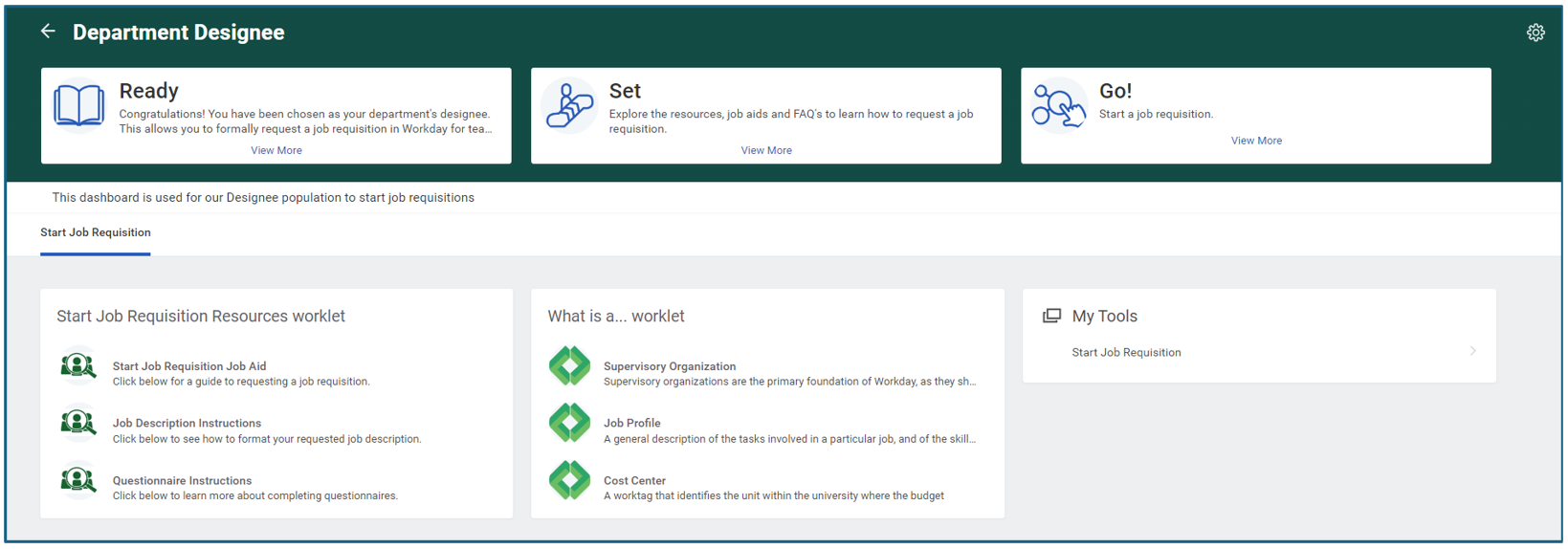 Welcome to the Department Designee dashboard. Here, you will find helpful tools and instructions to assist you in initiating a job requisition.