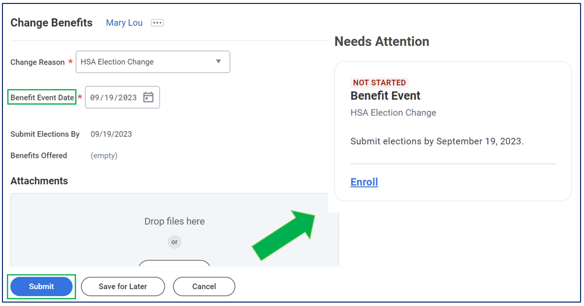 Enter the Benefits Event Date and click Submit. This will bring you to the page where you can Enroll.