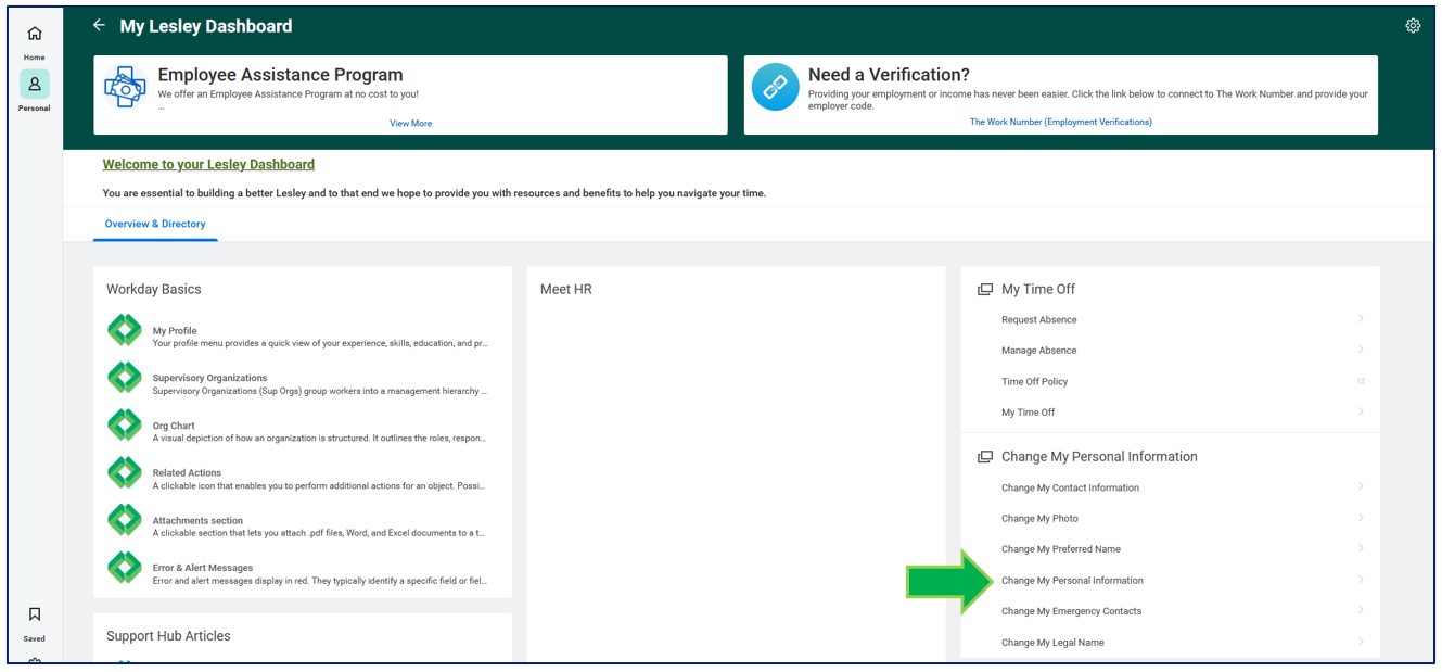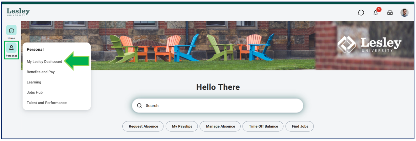 Click the My Lesley Dashboard application from the Personal category on the navigational panel on the left-hand side on your Workday homepage.