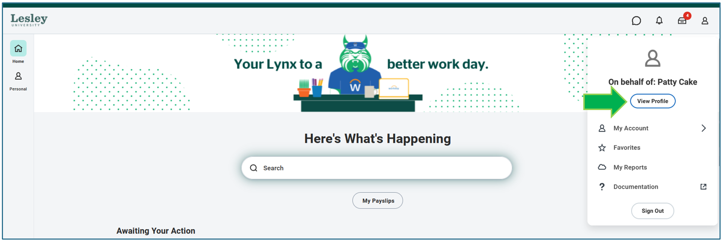 To update your pronoun, you will go to your Workday profile by clicking the person icon on the top right of your screen and click View Profile under your name.