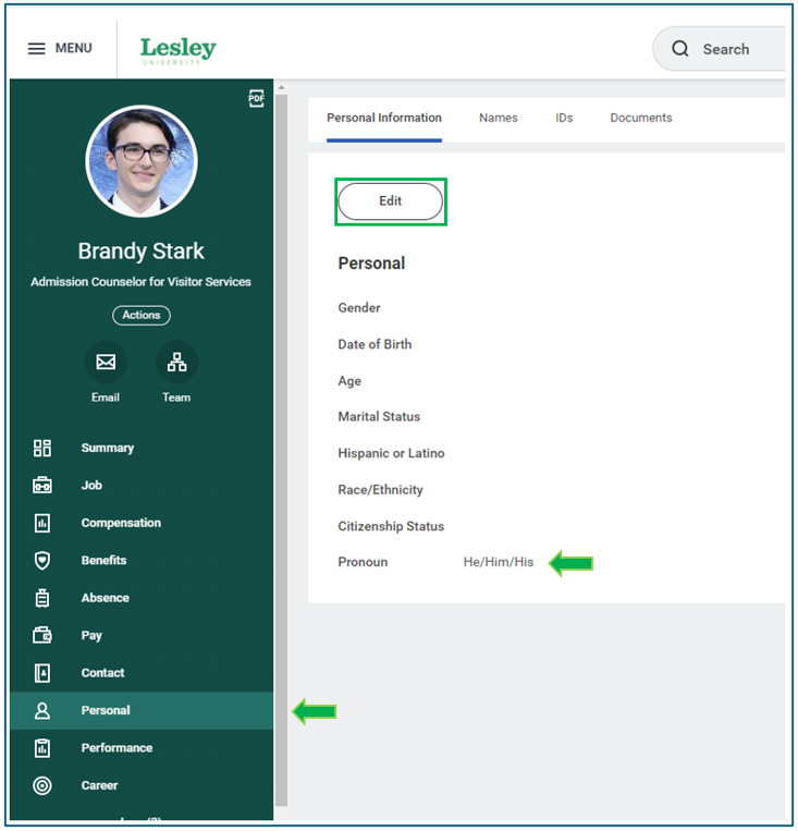 When you click Edit, each section of your personal information will be editable to allow changes. Next to the Pronoun section, you will find a pencil icon. By clicking the pencil icon, you will be able to make a change.