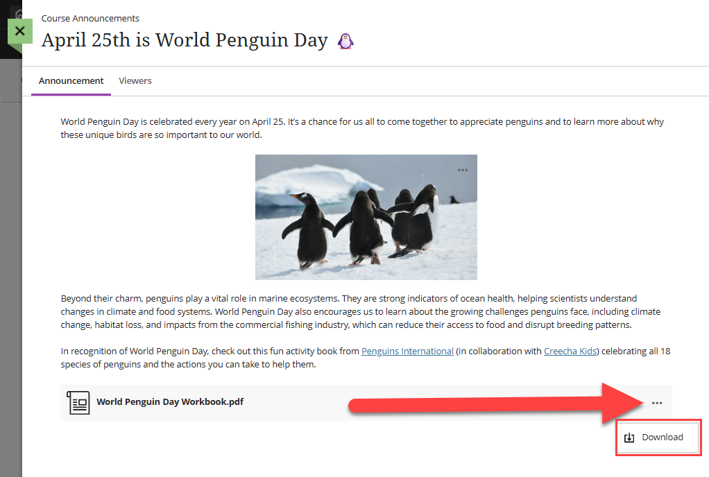 When this same Announcement is sent as an email, images will display in the email, but any attached or embedded content may not appear or will appear as text-only.