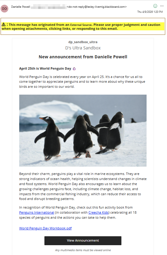 When this same Announcement is sent as an email, images, media, and attachments will display somewhat differently, Images will display as a small preview image, and media and attachments will display as links. You may click on the image or individual links to view the content in your browser or click View Announcement to view the Announcement in your course/organization.