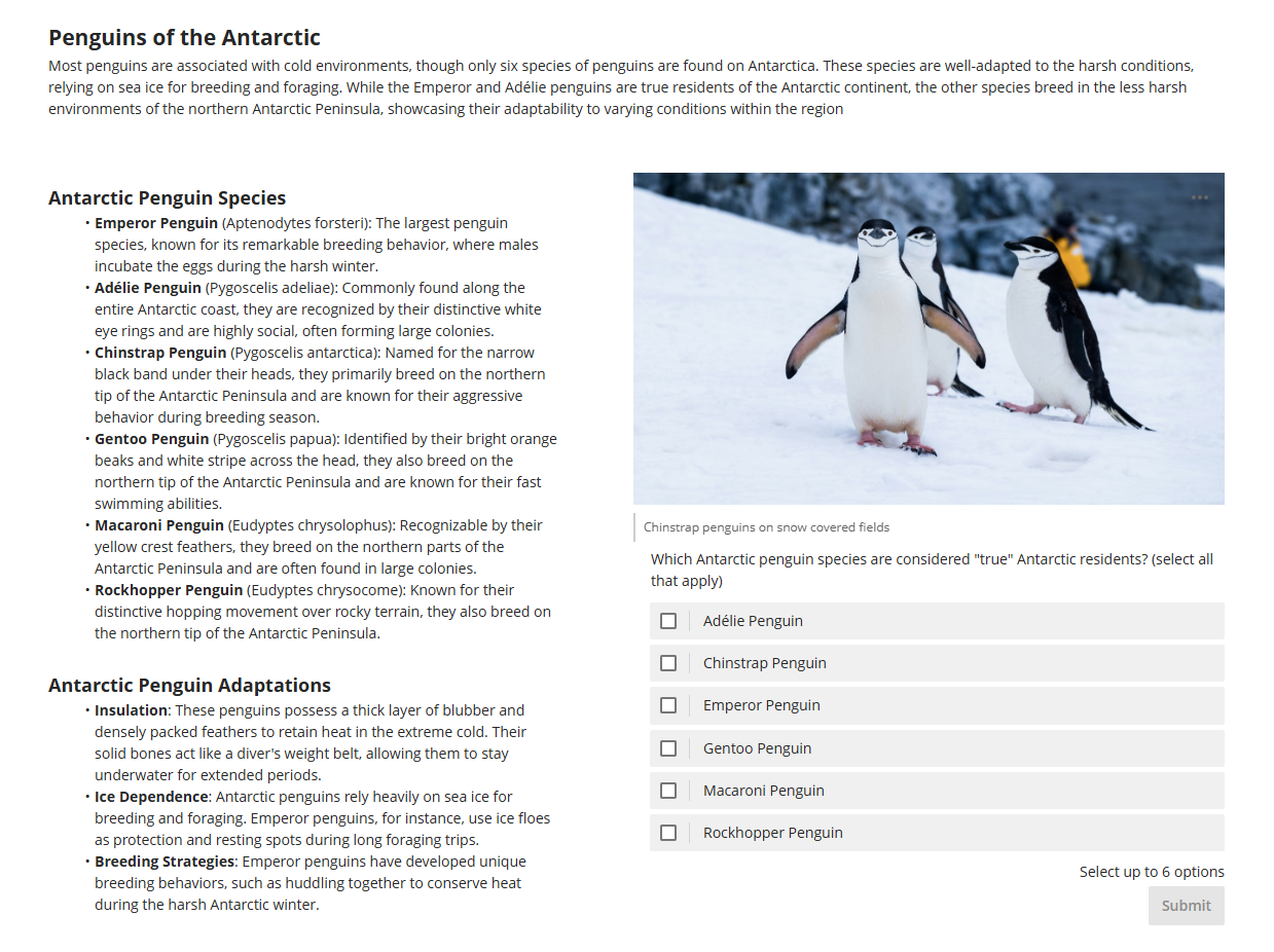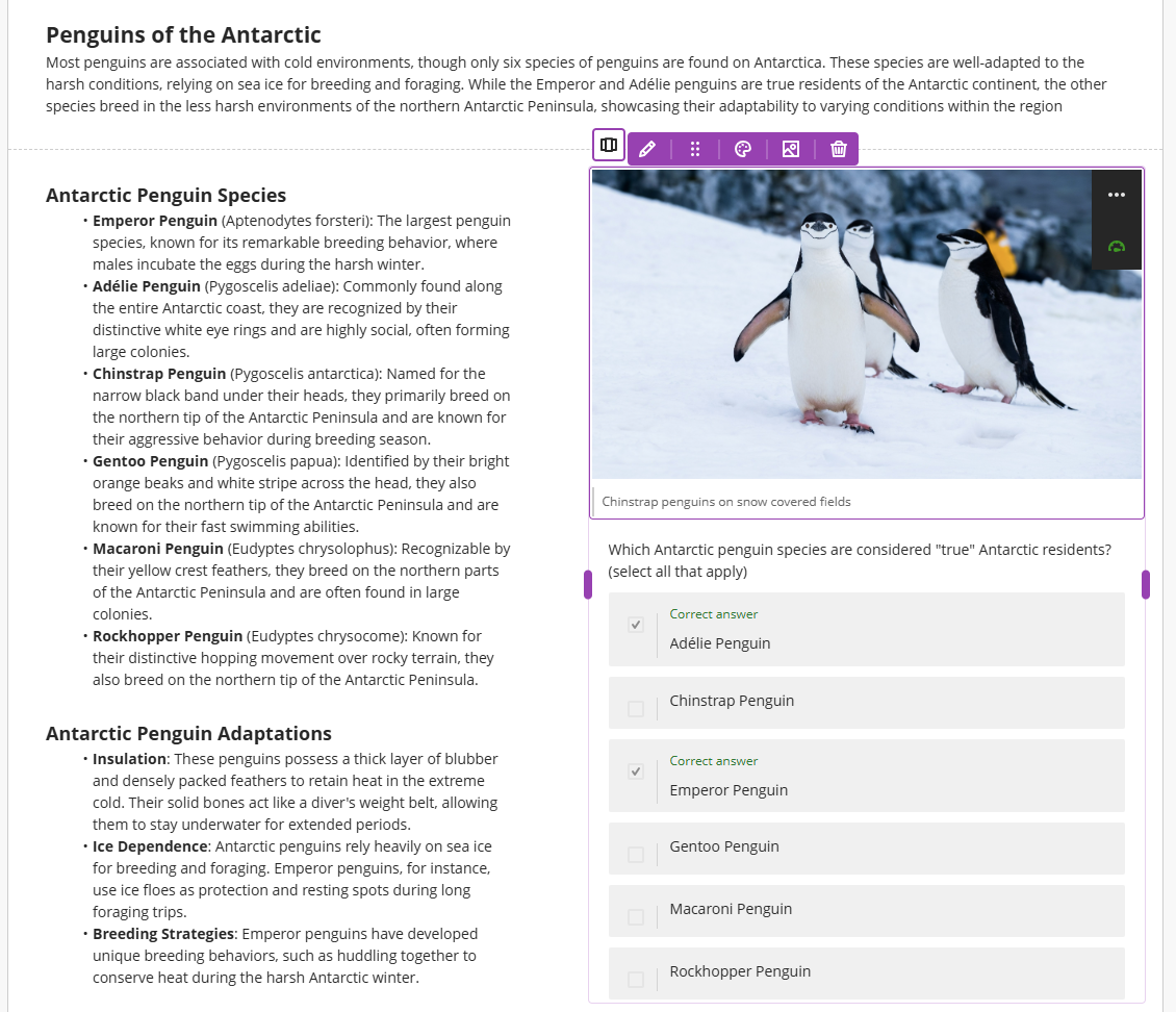 The Knowledge Check block allows you to create multiple choice and multiple answer questions for students to engage with and receive immediate feedback.
