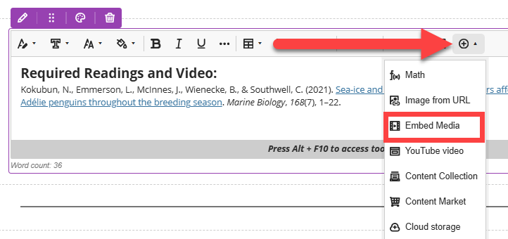 You may easily embed your online media in a Content Block. Using the Text/Content Editor, click the Insert Content (+) button. This will open a menu. Select Embed Media.