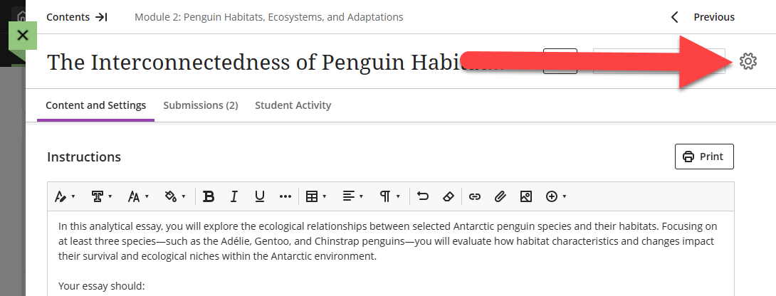 You may assign an assessment to a group when you are creating or editing an Assignment. Click on the Assignment Settings (gear icon) to open the Assignment Settings Panel.