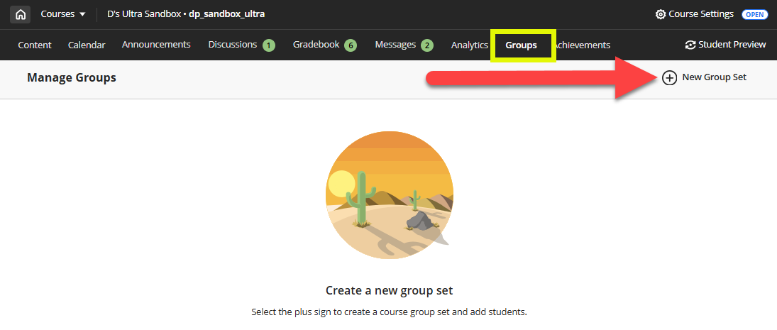 To create a Course Group, click on the Groups link at the top of the page. This will bring you to the Groups page. Click New Group Set to create a new group.