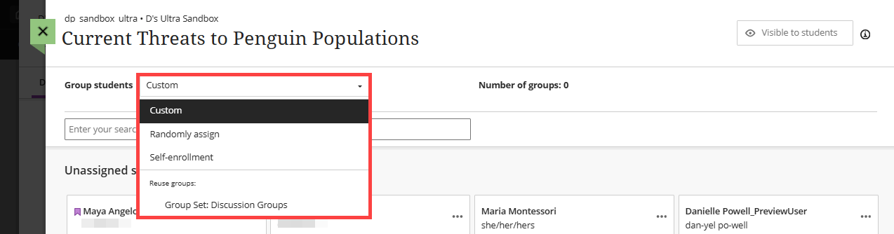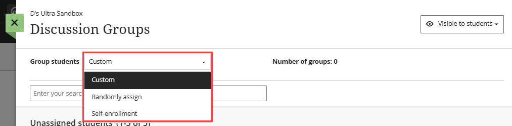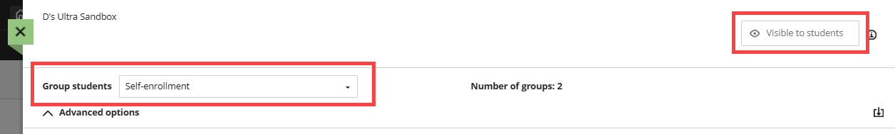 In order to create self-enrollment groups, you will first need to make the groups visible to students by selecting Visible to students at the top of the page. Then, in the Group Students menu, select Self-Enrollment