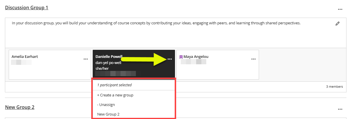 Once assigned, you can move students from one group to another. Select a student that you want to move and click the menu (three dots) icon next to their name. Select a different group to move the student to that group.