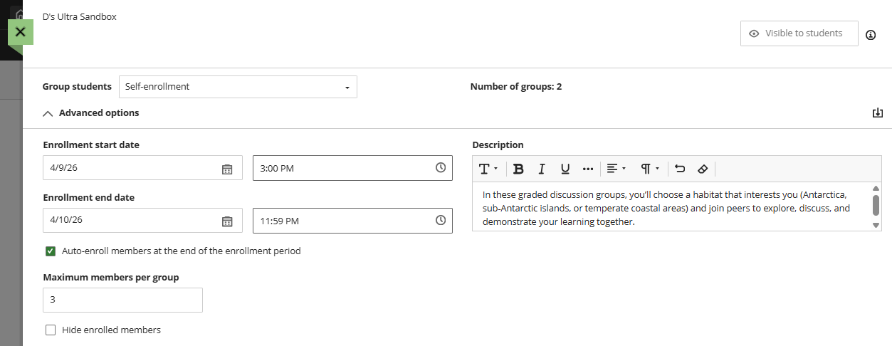 • Hide Enrolled Members: Select this option to prevent students from seeing who has already joined a group. Students will be able to see their group members once the enrollment period has ended.