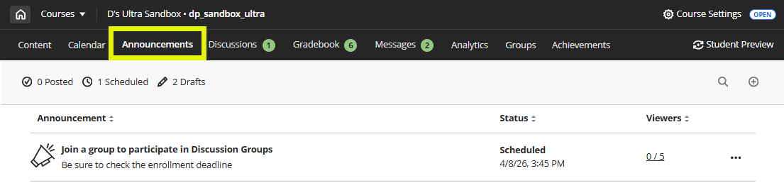 When you create self-enrollment groups, an Announcement is created automatically. If you scheduled your self-enrollment period in the future, you may edit the Announcement to add additional information or details before the scheduled posting date and time.