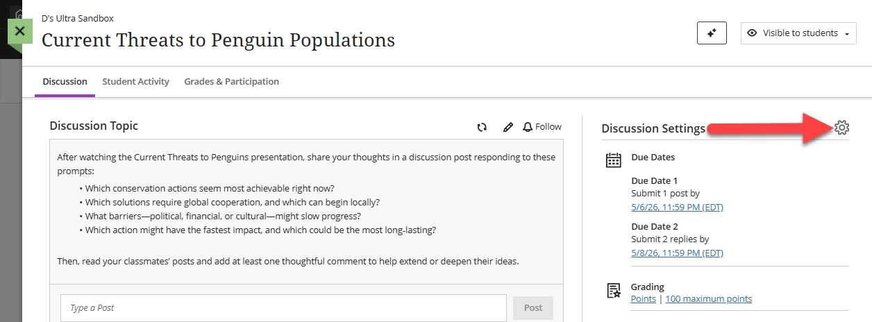 To view your students' contributions to the group discussion, locate the discussion either from the Course Content page or the Discussions page and click on the title to open.