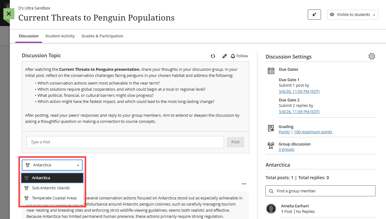 Once you have created or selected your groups, click Save to return to your Discussion and then click Save to save your changes.